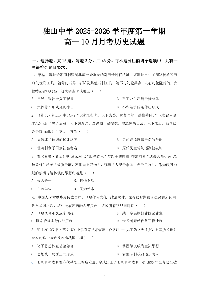 安徽省六安市独山中学2025-2026学年高一上学期10月月考 历史试题(含答案).docx