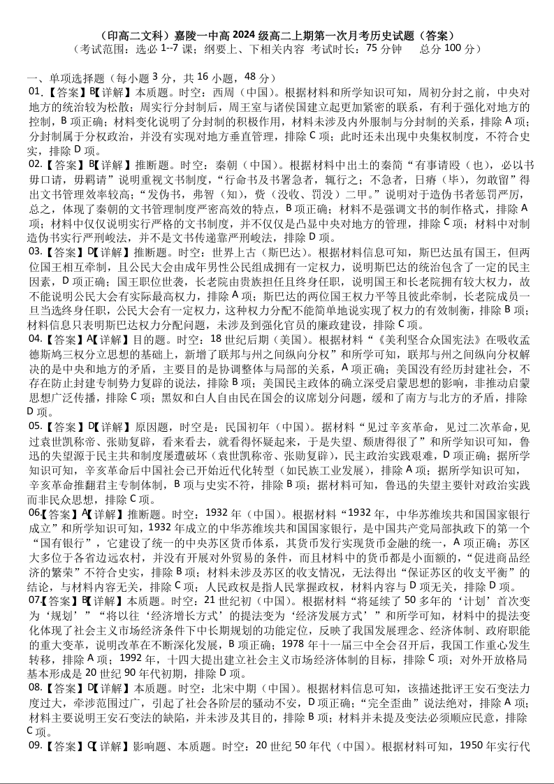 四川省南充市嘉陵一中2025-2026学年高二上学期10月月考 历史答案.docx