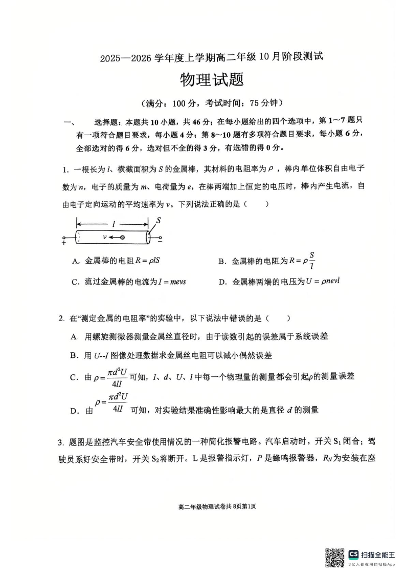 辽宁省大连市第八中学2025-2026学年高二上学期10月阶段测试 物理试题(含答案).pdf