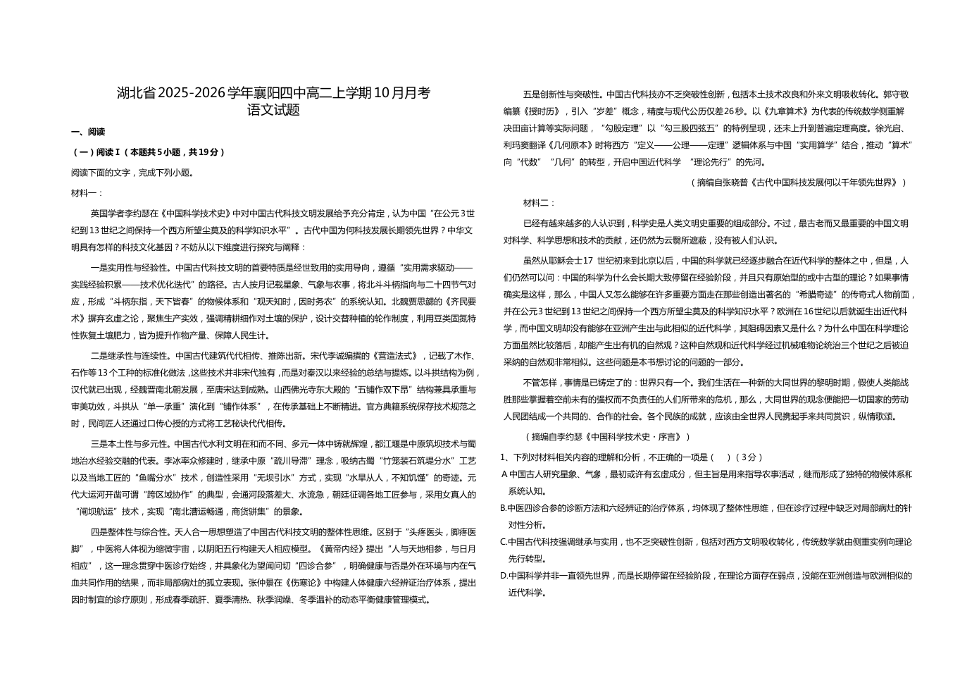 湖北省襄阳市第四中学2025-2026学年高二上学期10月月考 语文试题(含答案).docx