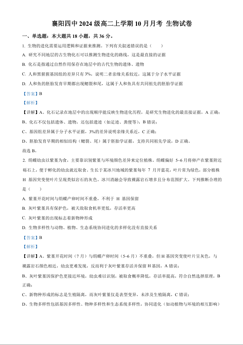 湖北省襄阳市第四中学2025-2026学年高二上学期10月月考 生物答案.docx