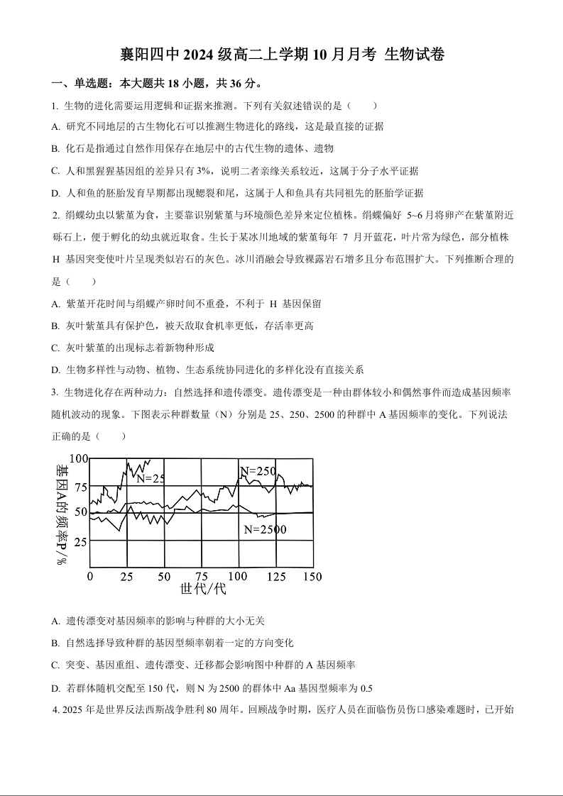 湖北省襄阳市第四中学2025-2026学年高二上学期10月月考 生物.docx