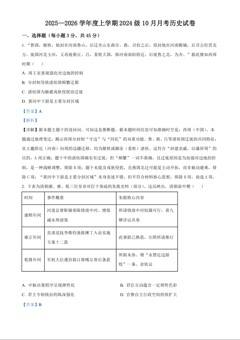 湖北省荆州市沙市中学2025-2026学年高二上学期10月月考 历史答案.docx