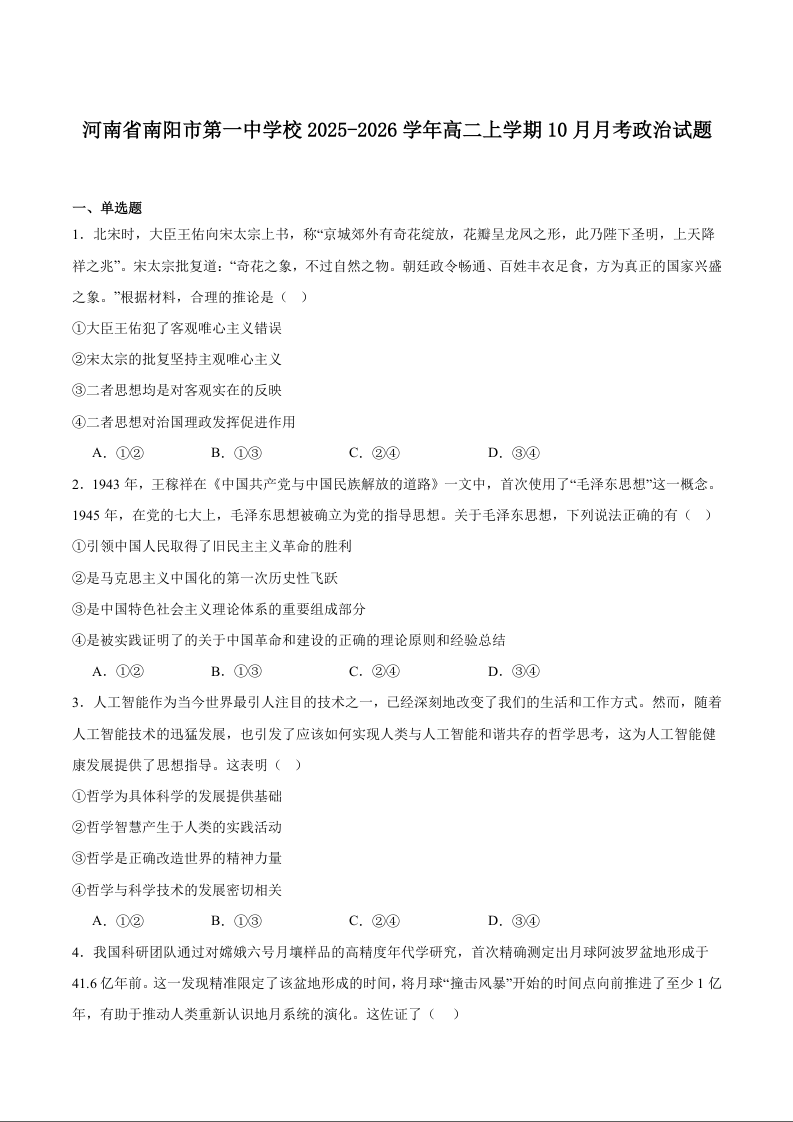 南阳市第一中学校2025-2026学年高二上学期第二次月考 政治试卷(含答案).docx
