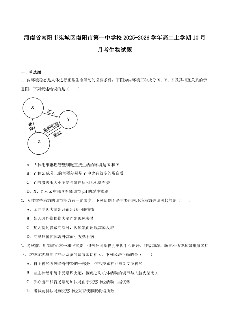 南阳市第一中学校2025-2026学年高二上学期第二次月考 生物试卷(含答案).docx