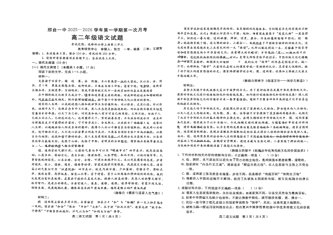 河北省邢台市第一中学2025-2026学年高二上学期10月第一次月考 语文试题(含答案).pdf