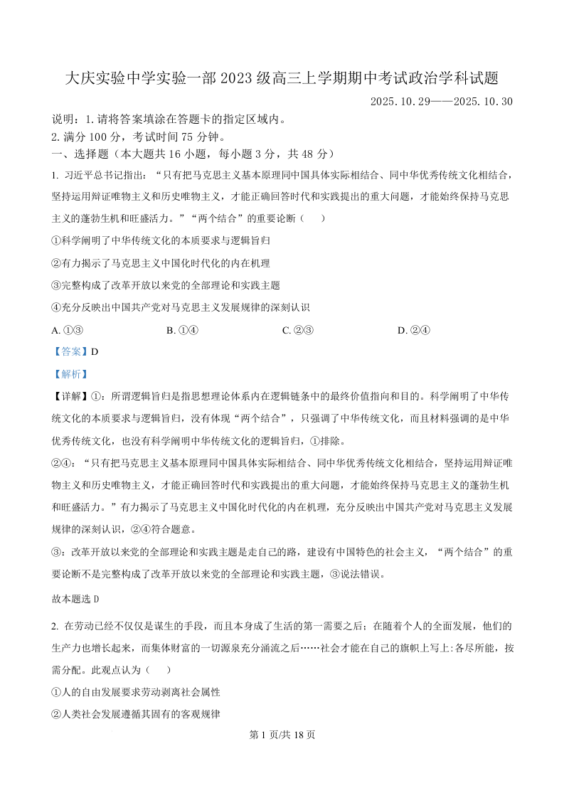黑龙江省大庆市实验中学2026届高三上学期期中考试 政治答案.docx