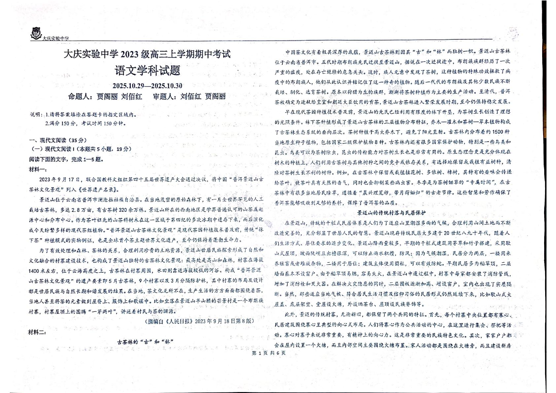 黑龙江省大庆市实验中学2026届高三上学期期中考试 语文.pdf
