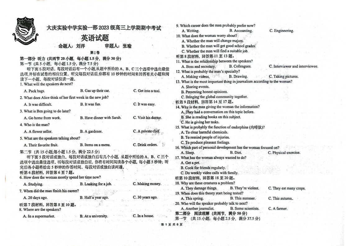 黑龙江省大庆市实验中学2026届高三上学期期中考试 英语.pdf