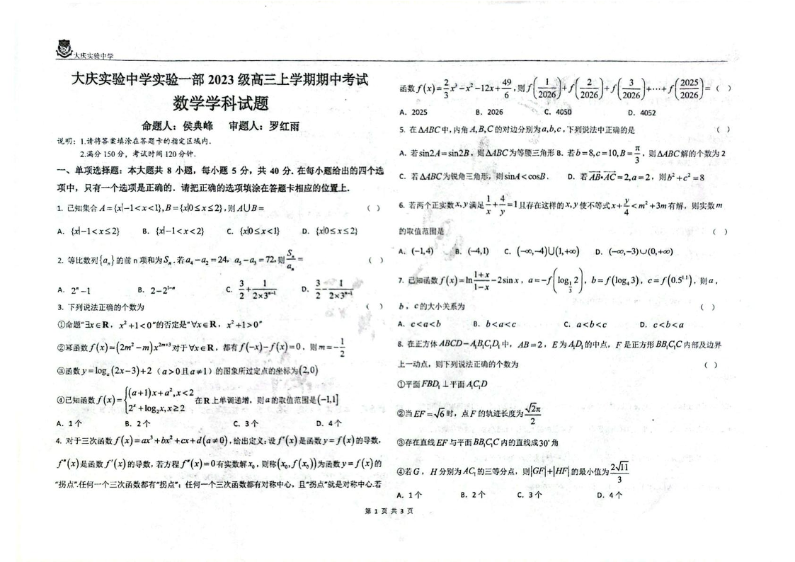 黑龙江省大庆市实验中学2026届高三上学期期中考试 数学.pdf