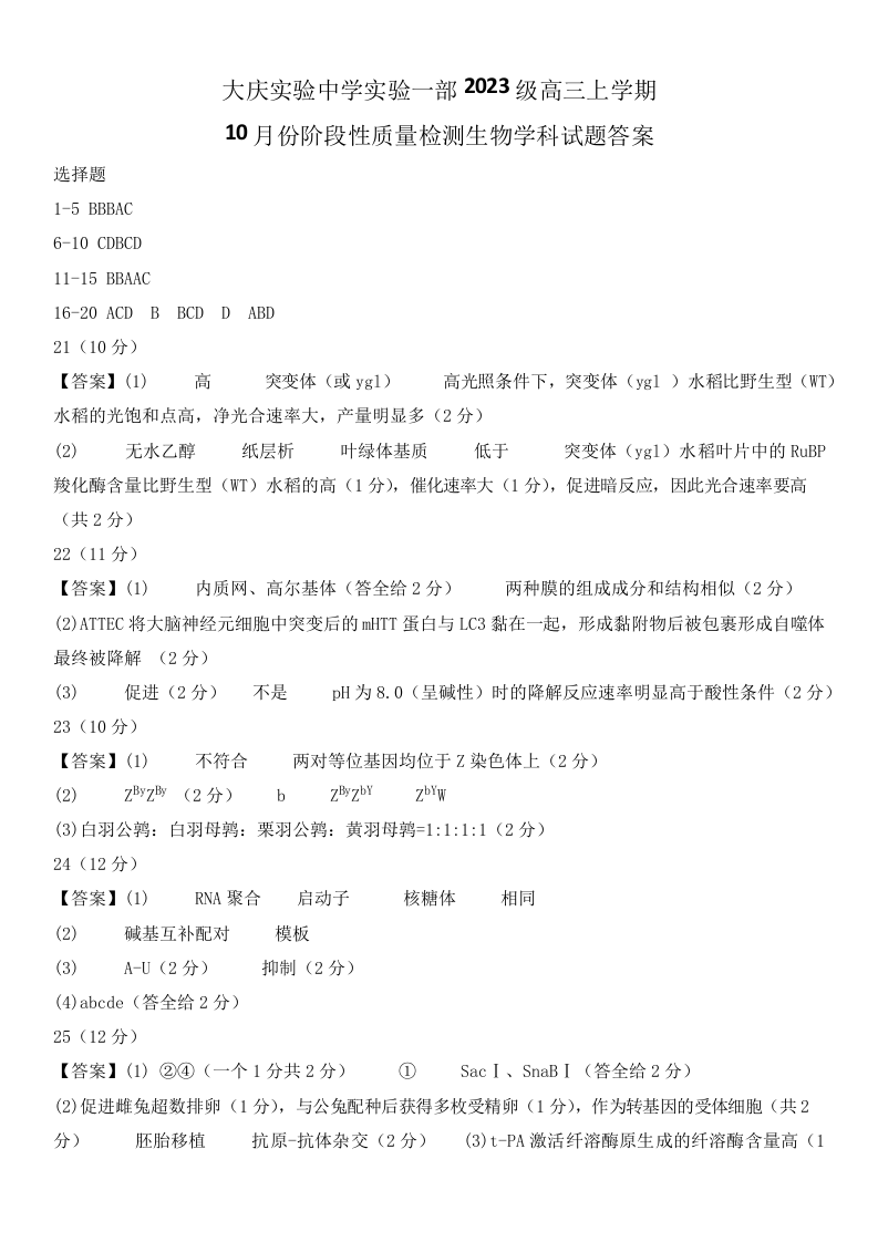 黑龙江省大庆市实验中学2026届高三上学期期中考试 生物答案.docx