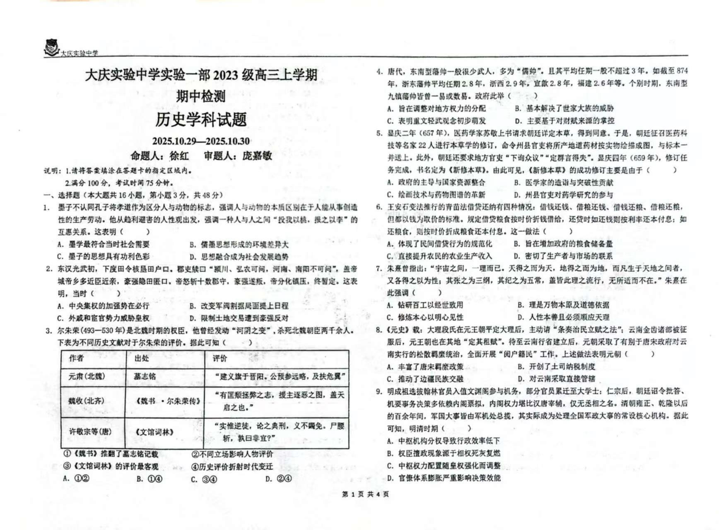 黑龙江省大庆市实验中学2026届高三上学期期中考试 历史.pdf