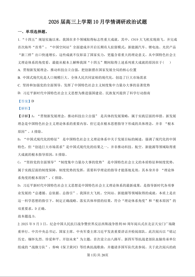 江苏省南京市、镇江市、徐州市联盟校2026届高三上学期10月学情调研 政治答案.docx