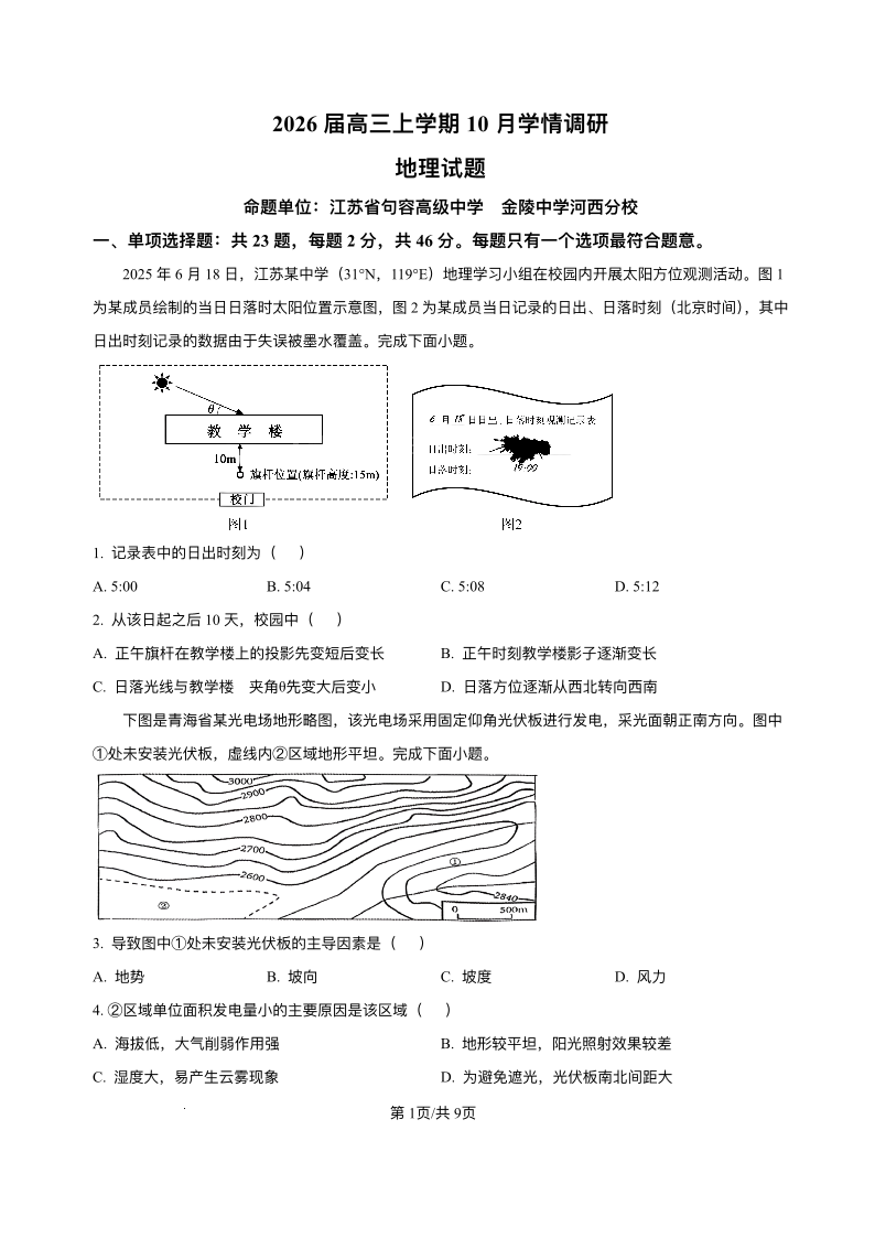 江苏省南京市、镇江市、徐州市联盟校2026届高三上学期10月学情调研 地理试题(含答案).pdf