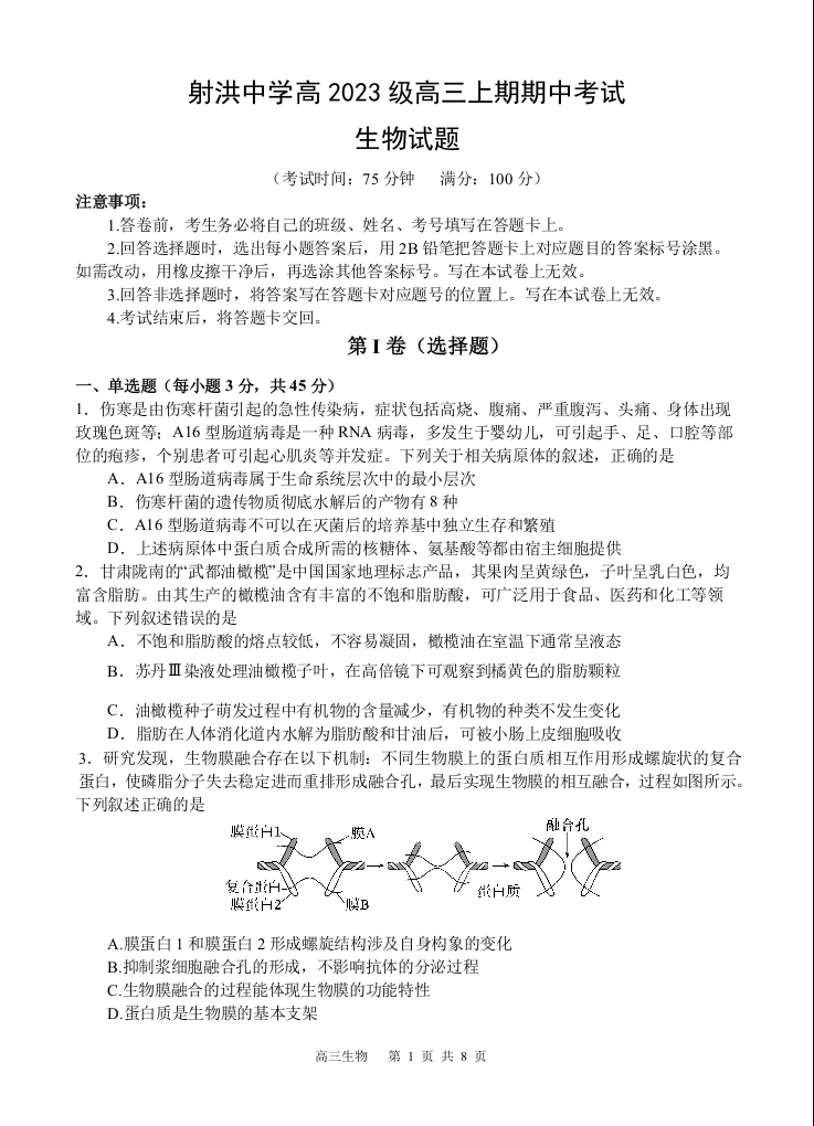 四川省遂宁市射洪中学2026届高三上学期期中考试 生物.docx
