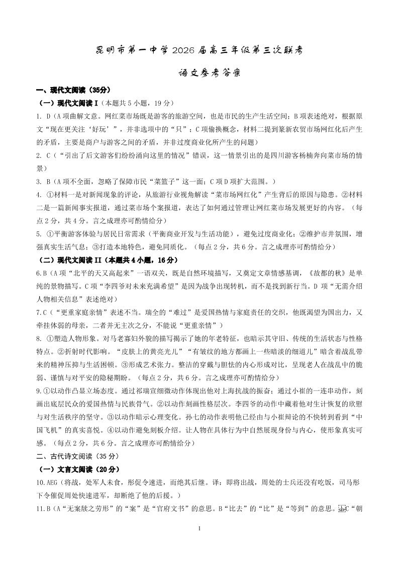 昆明市第一中学2026届高三年级第三次联考 语文答案.pdf