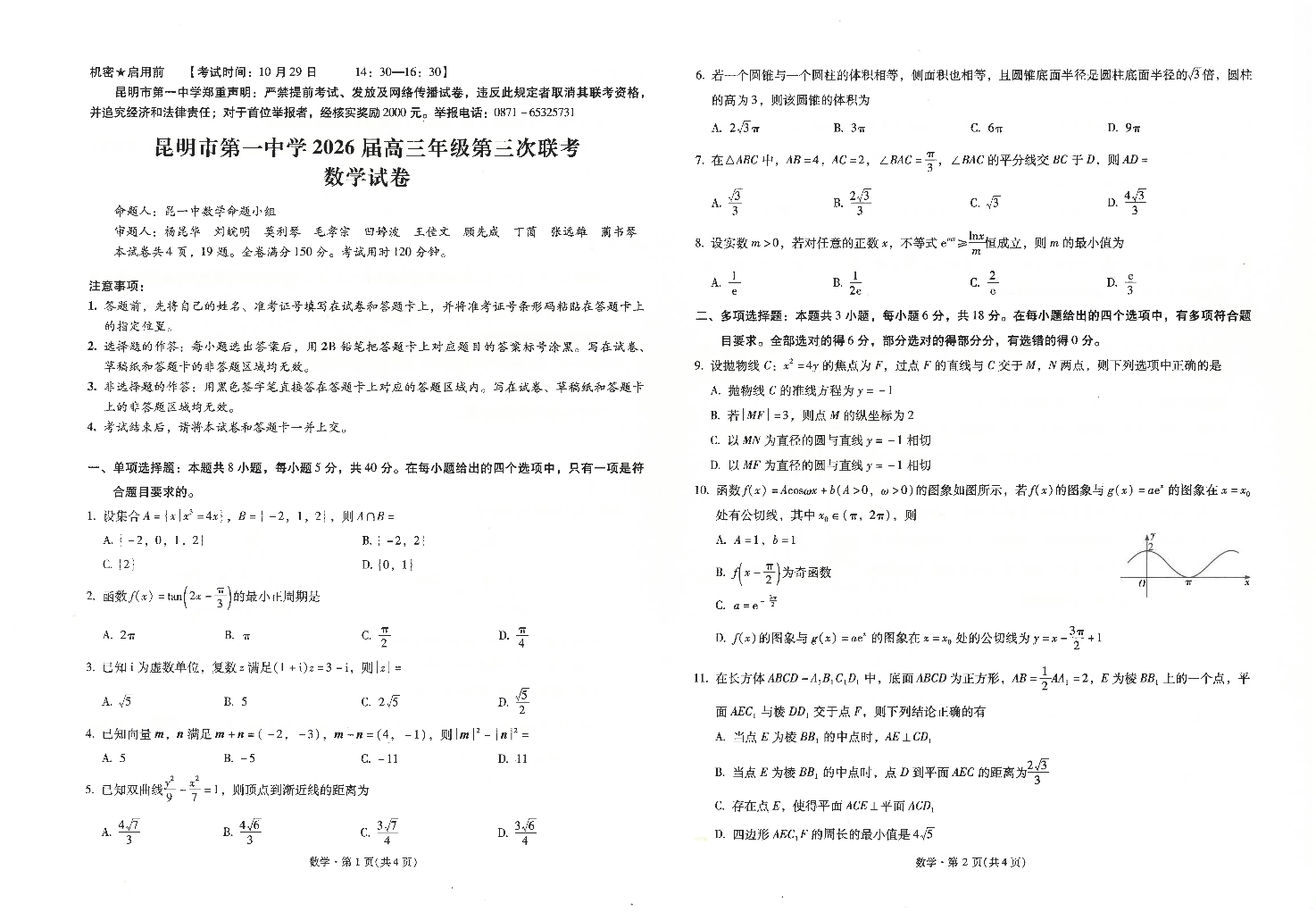 昆明市第一中学2026届高三年级第三次联考 数学.pdf