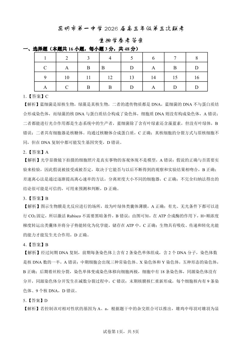 昆明市第一中学2026届高三年级第三次联考 生物答案.pdf