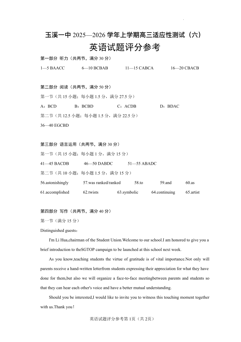 玉溪一中2025—2026学年上学期高三适应性测试(六)英语答案.pdf