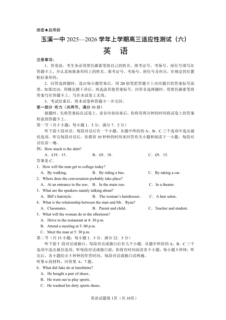 玉溪一中2025—2026学年上学期高三适应性测试(六)英语.pdf