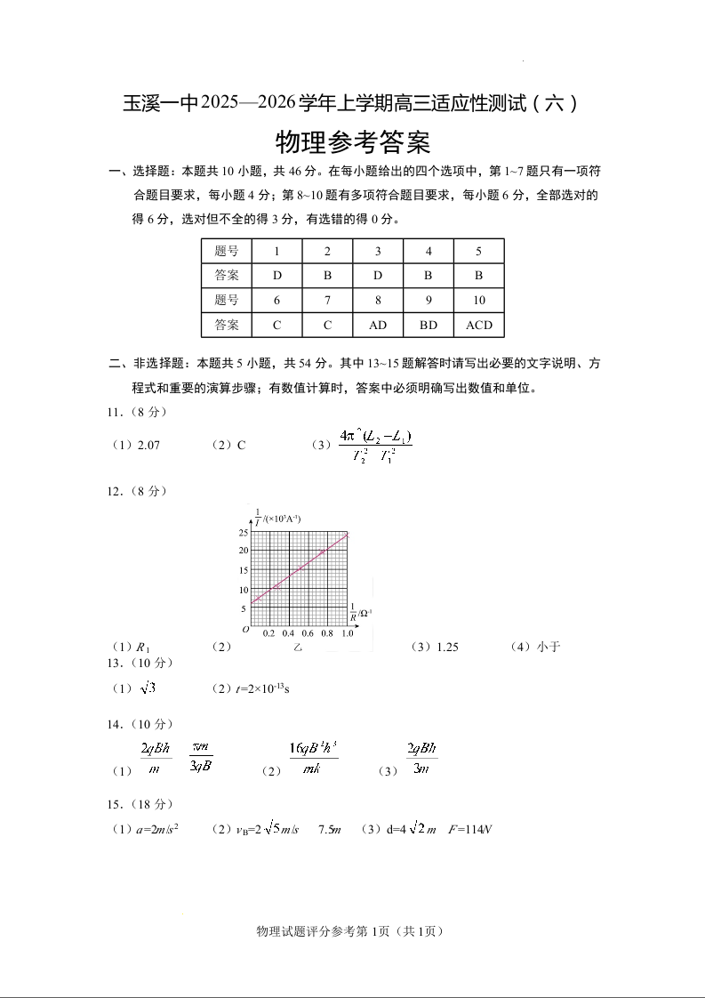 玉溪一中2025—2026学年上学期高三适应性测试(六)物理答案.docx