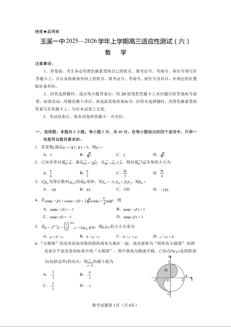 玉溪一中2025—2026学年上学期高三适应性测试(六)数学.docx