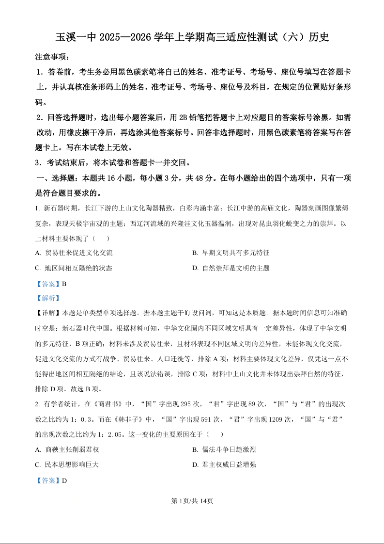 玉溪一中2025—2026学年上学期高三适应性测试(六)历史答案.docx