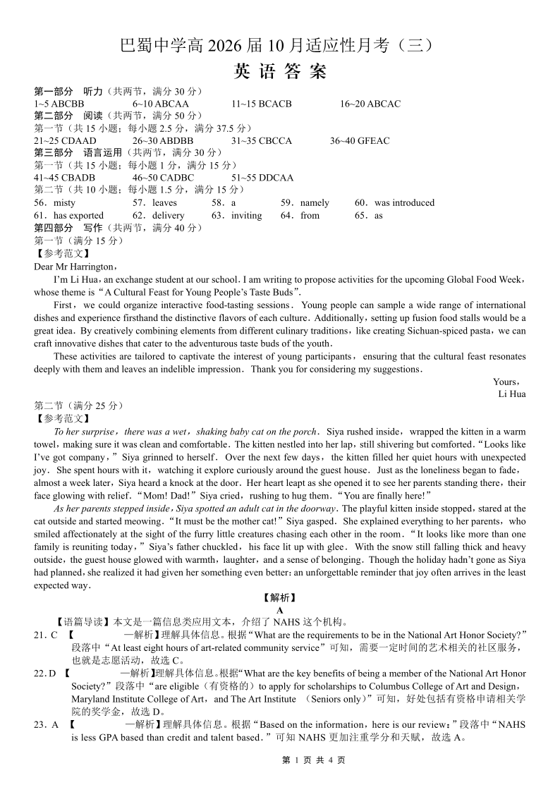 巴蜀中学2026届高考适应性月考卷(三)英语答案.pdf
