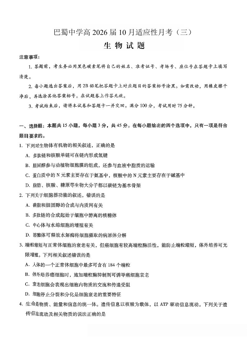 巴蜀中学2026届高考适应性月考卷(三)生物.pdf
