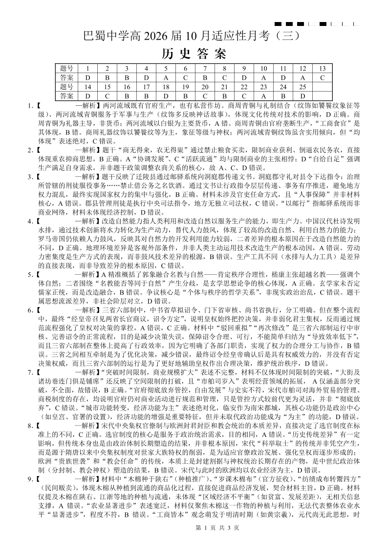 巴蜀中学2026届高考适应性月考卷(三)历史答案.pdf