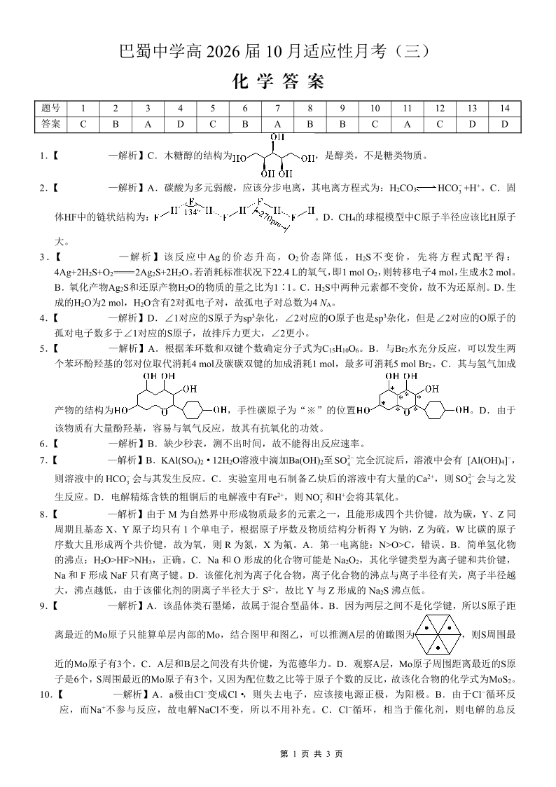 巴蜀中学2026届高考适应性月考卷(三)化学答案.pdf