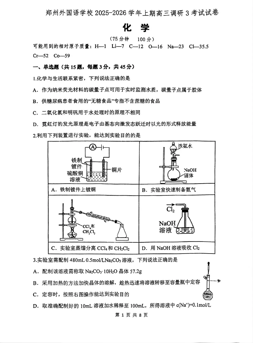 郑州外国语学校2025-2026学年高三上期第三次调研考试 化学.pdf