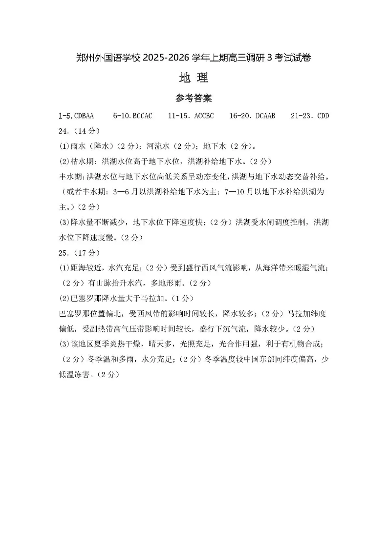 郑州外国语学校2025-2026学年高三上期第三次调研考试 地理答案.pdf