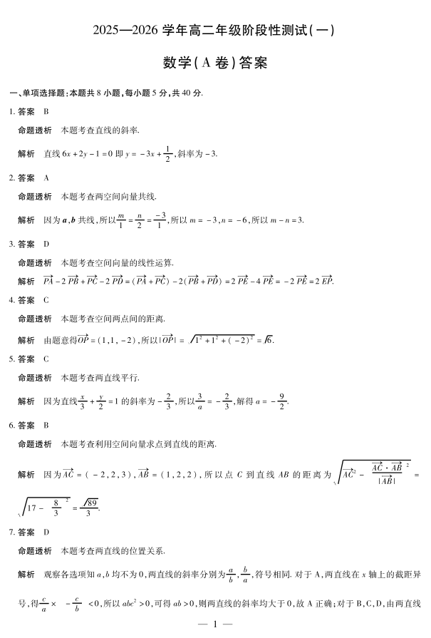 【数学A卷答案】天一大联考·2025-2026学年高二年级阶段性测试(一).pdf
