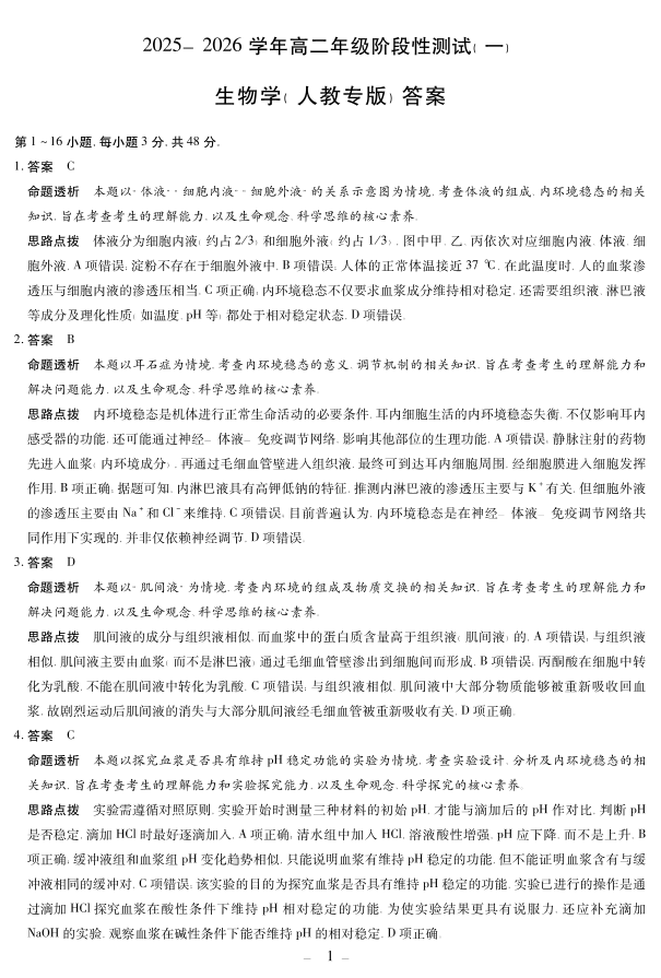 【生物学人教专版答案】天一大联考·2025-2026学年高二年级阶段性测试(一).pdf