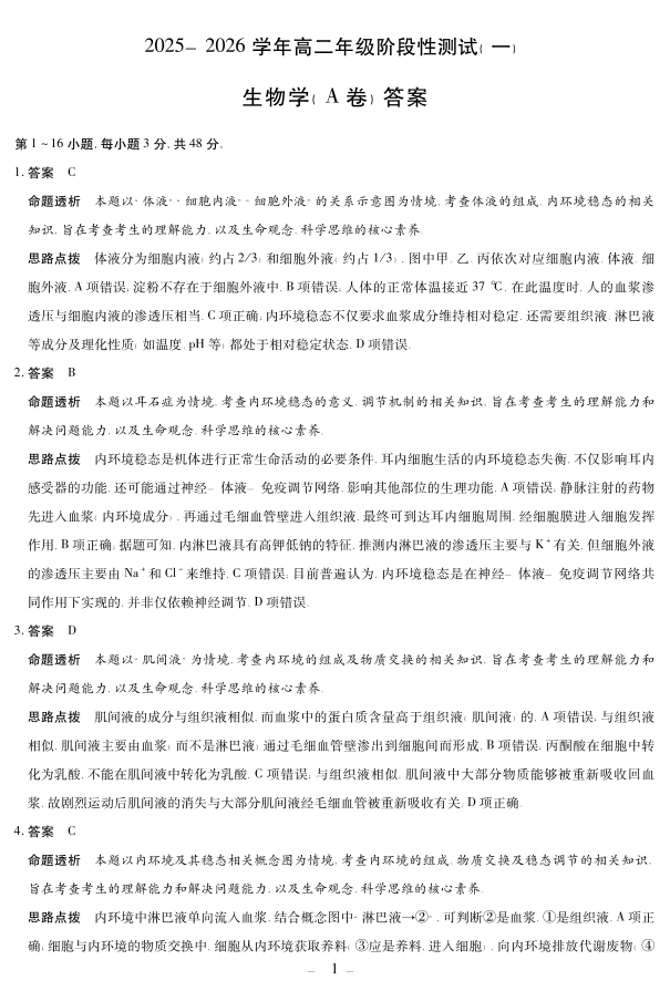 【生物学A卷答案】天一大联考·2025-2026学年高二年级阶段性测试(一).pdf