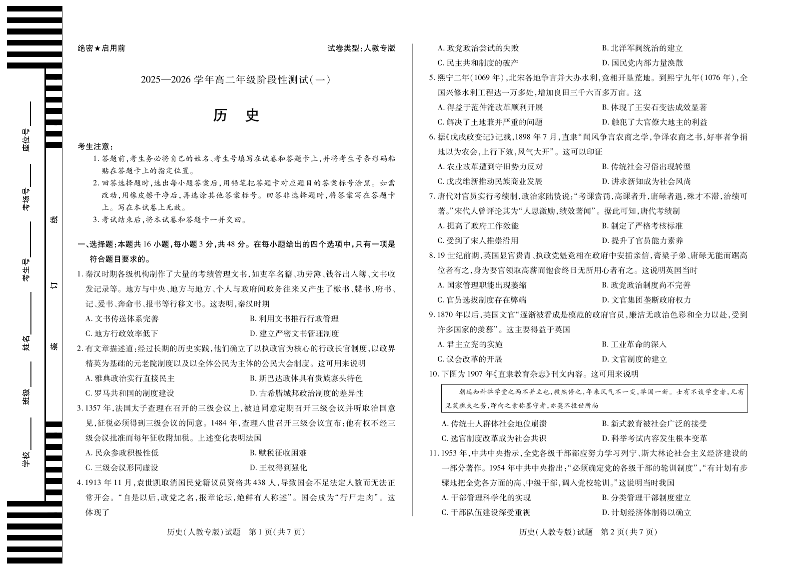 【历史人教专版】天一大联考·2025-2026学年高二年级阶段性测试(一).pdf