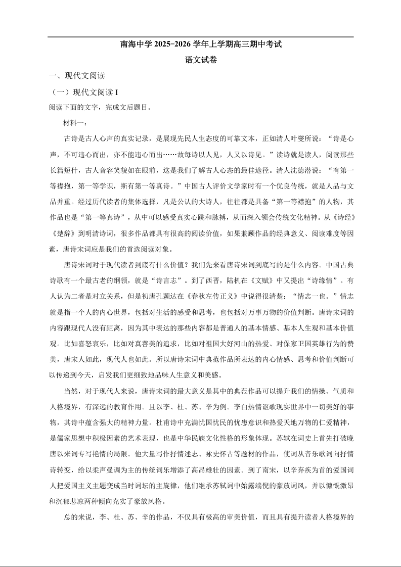 南海中学2025-2026学年上学期高三期中考试 语文.docx
