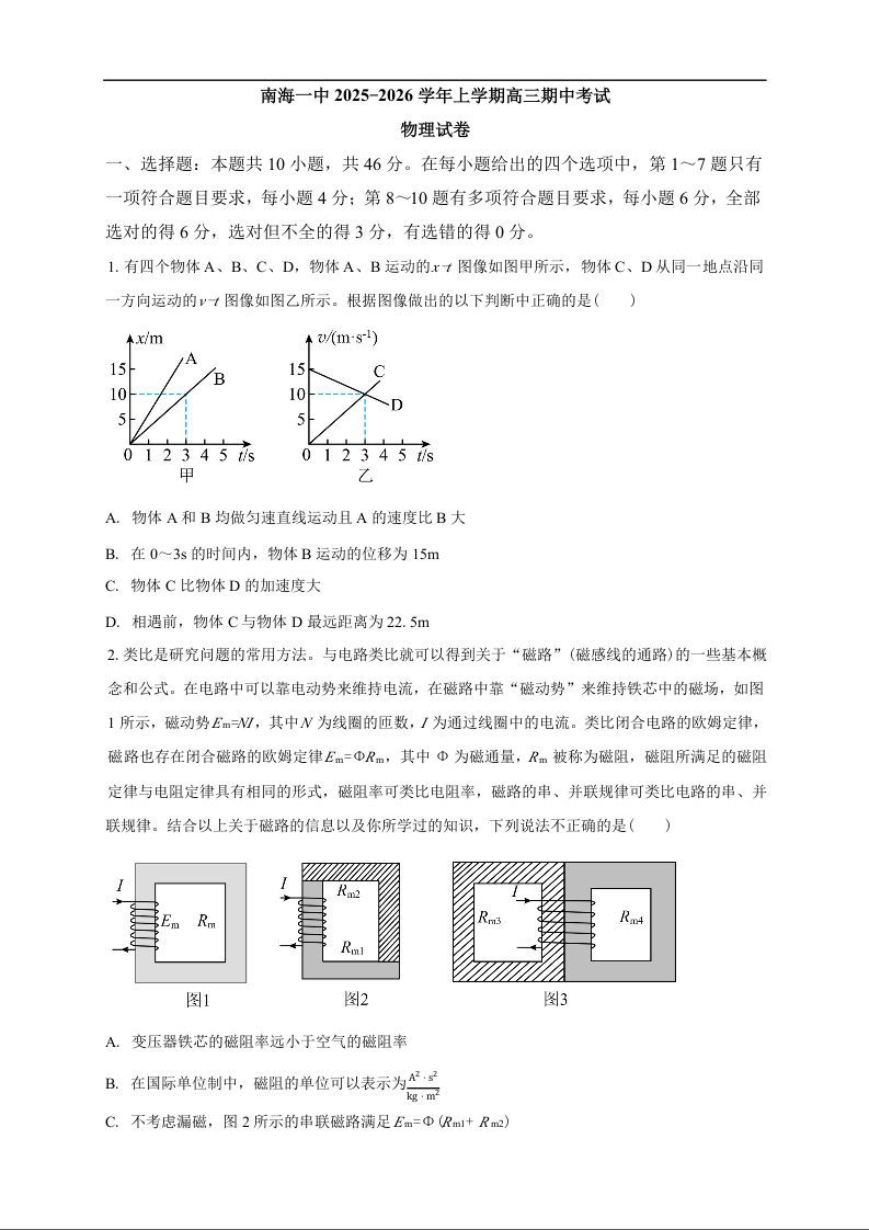 南海中学2025-2026学年上学期高三期中考试 物理.docx