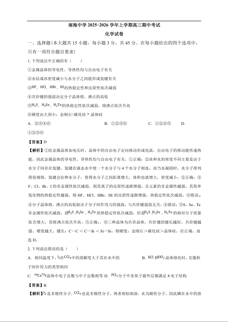南海中学2025-2026学年上学期高三期中考试 化学答案.docx