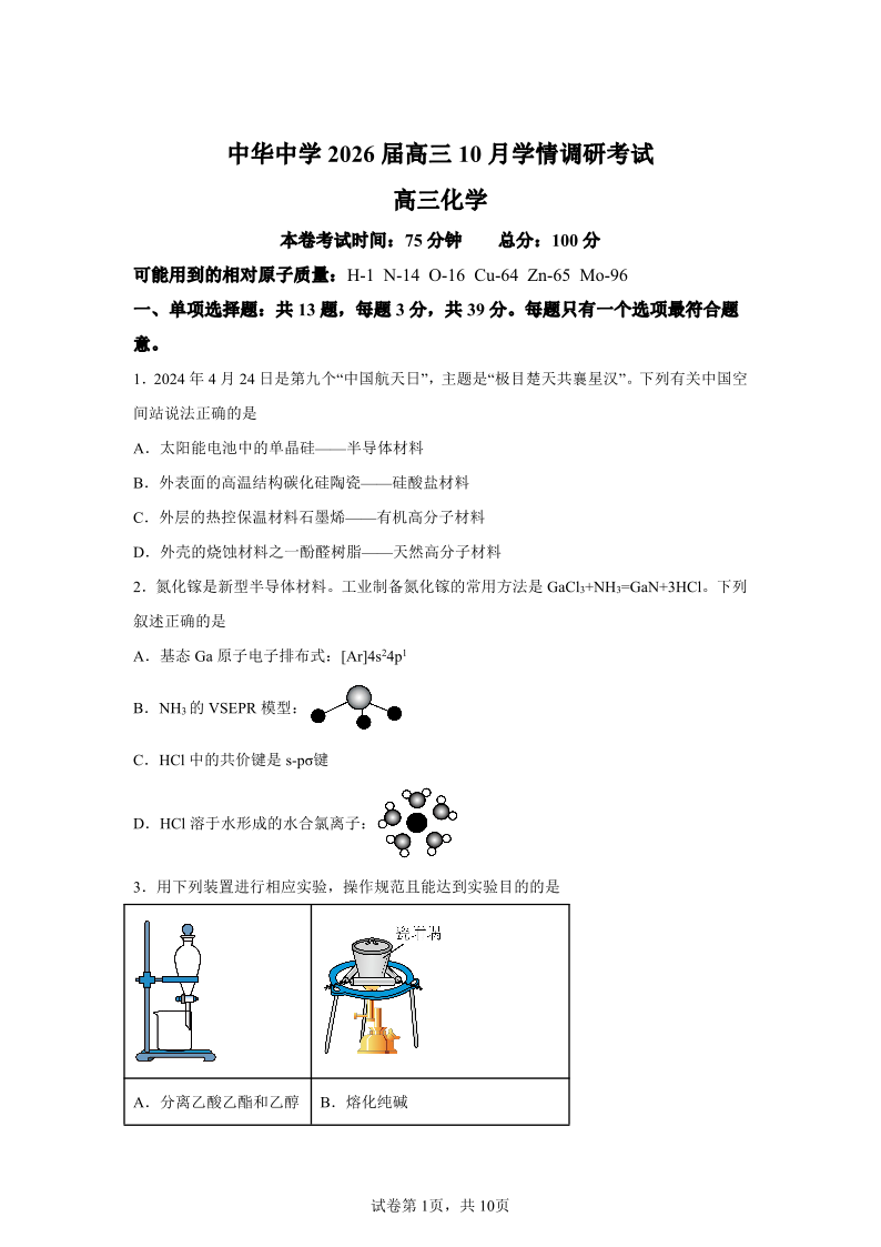 江苏省南京市中华中学2026届高三上学期10月学情调研考试 化学试题(含答案).pdf