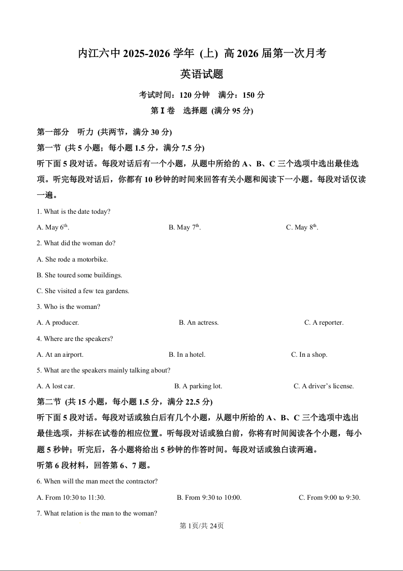 四川省内江市六中2026届高三上学期第一次月考 英语答案.docx