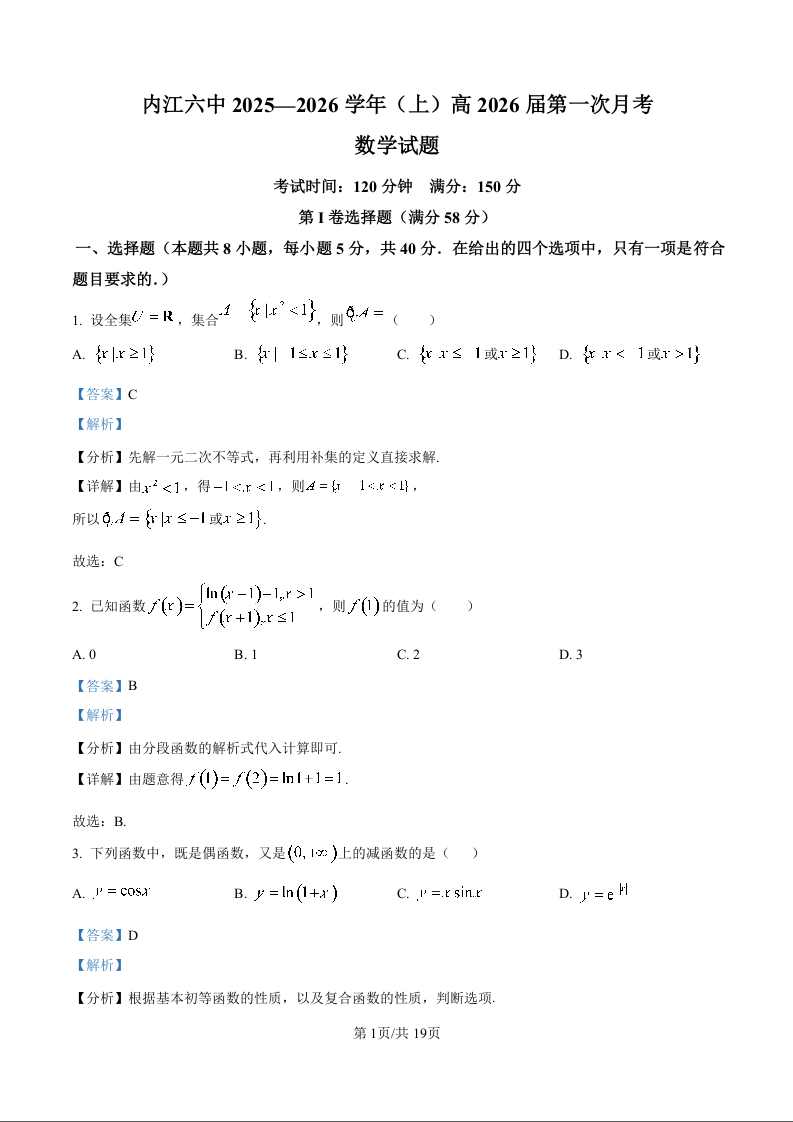 四川省内江市六中2026届高三上学期第一次月考 数学答案.docx