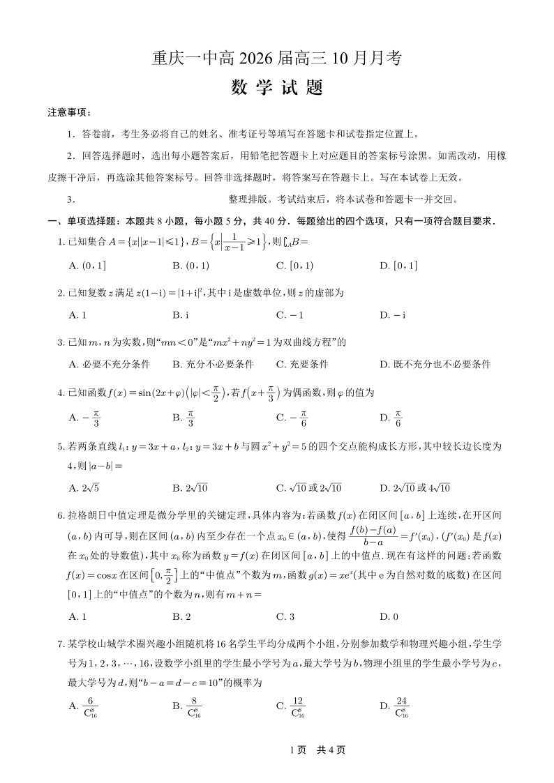 重庆一中高2026届高三10月月考 数学.pdf