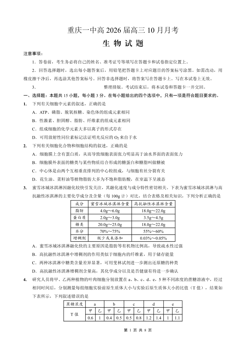 重庆一中高2026届高三10月月考 生物.pdf