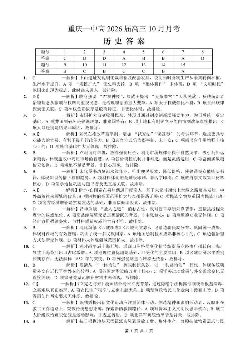 重庆一中高2026届高三10月月考 历史答案.pdf