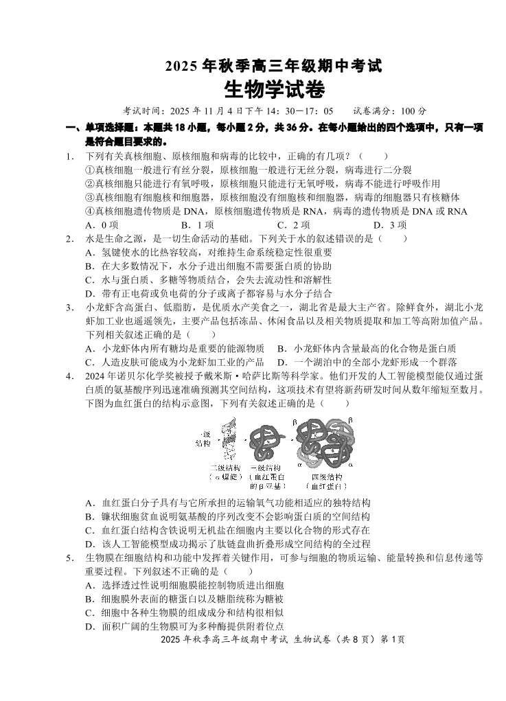 鄂东南2025年秋季高三年级期中考试 生物.pdf