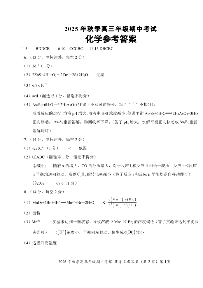 鄂东南2025年秋季高三年级期中考试 化学答案.pdf