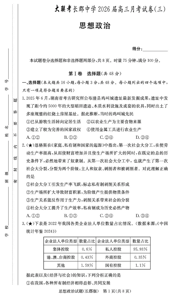 长郡中学2026届高三月考试卷(三)政治.pdf