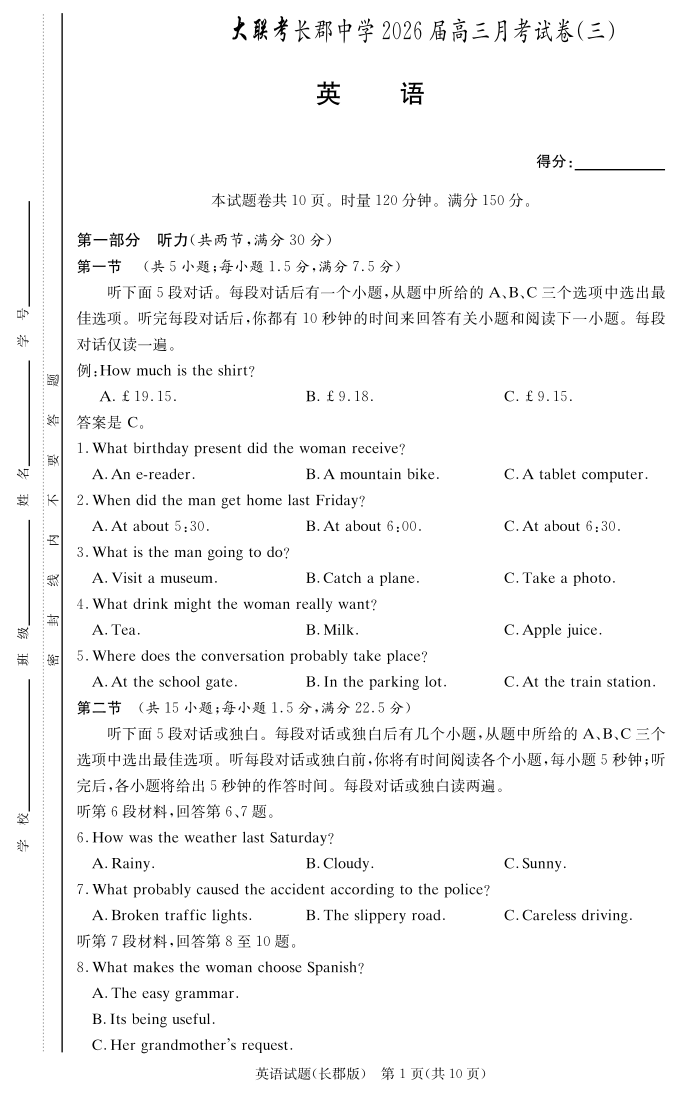 长郡中学2026届高三月考试卷(三)英语.pdf